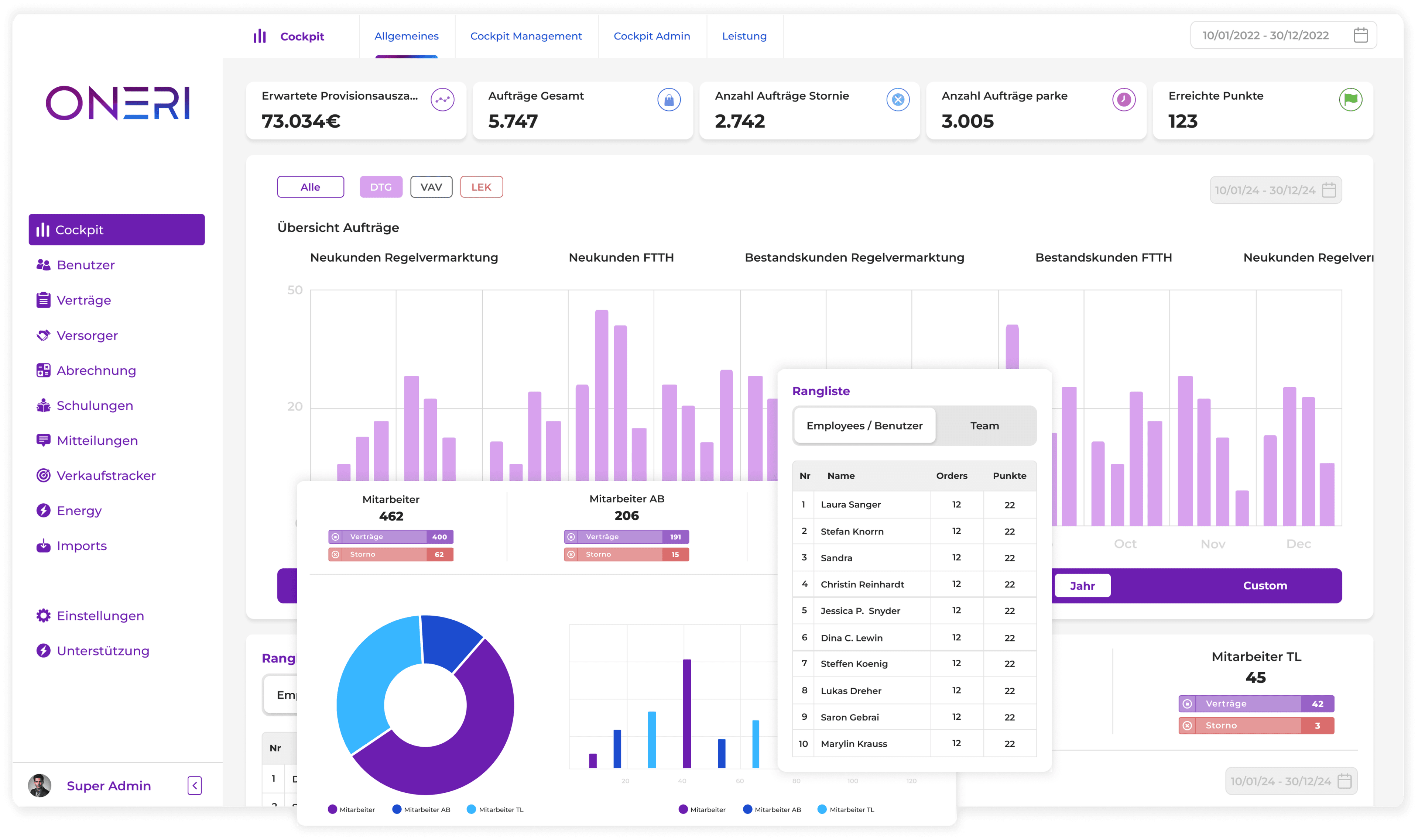 Durch die Nutzung der verschiedenen Module von ONERI können Unternehmen alle Verkaufsaktivitäten und -leistungen vollständig digitalisieren und verwalten. Durch das Einrichten von Anreizen und Teamvergütungen, das Hinzufügen von Verträgen und Leads/Kontakten zum System und das Erstellen von Benutzerkonten kann ONERI in Betrieb genommen werden.Das System ermöglicht es Ihnen, mehrere Teams und Kunden zu erstellen und mehrstufige Boni einzurichten, die mithilfe des Abrechnungsmoduls bis ins kleinste Detail automatisch berechnet werden können.Nach der Einrichtung können Unternehmen verschiedene Berichte erstellen und tägliche Aktivitäten verfolgen, mit Teams an verschiedenen Standorten kommunizieren und Schulungsmaterialien über die Academy-Module bereitstellen. Insgesamt bietet ONERI eine umfassende Lösung zur Digitalisierung und Optimierung der Vertriebsprozesse.